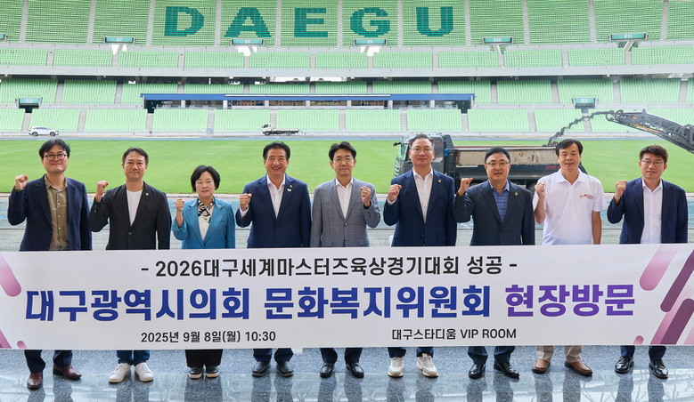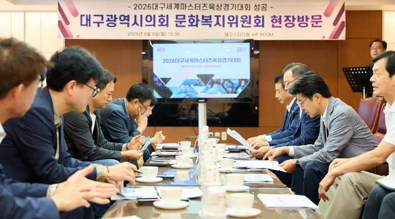 [대구 세계타임즈=한윤석 기자] 대구시의회 문화복지위원회(위원장 박창석)는 제319회 임시회 기간 중인 9월 8일(월), 2026 대구세계마스터즈 육상경기대회를 1년 정도 앞두고 조직위원회(대구스타디움 내)를 방문해 시설 및 대회 준비 상황 등을 점검하는 시간을 가졌다.