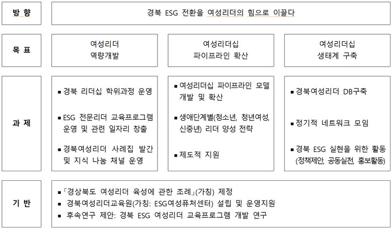 이번 연구용역은 경북에서 활동하는 정치, 경제, 사회 등 각 분야의 여성리더를 대상으로 델파이조사와 심층면담을 통해 경북형 여성리더십 역량을 도출했다. 또한 최근 ESG 필요성 확산과 ESG 관련 여성리더로써 역할이 강화되는 사회적 환경 변화에 맞추어, 차세대 경북의 ESG 혁신을 이끌어 갈 여성리더를 양성하는 방향을 설정하고 △여성리더 성장 지원 △여성리더십 파이프라인 확산 △여성리더십 생태계 구축의 3대 목표를 설정하고 9개의 과제를 도출했다.