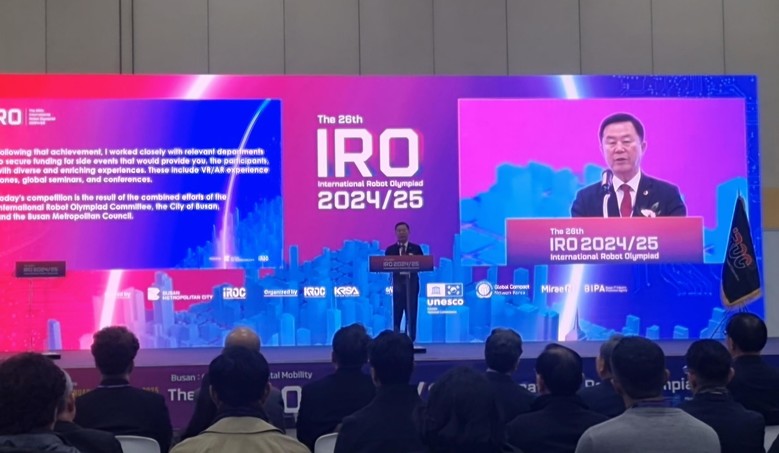 [부산 세계타임즈=이용우 기자] 부산광역시의회 기획재경위원회 이승우 의원(국민의힘, 기장군2)이 지난 17일, 벡스코에서 개최된 ‘제26회 24/25 국제로봇 올림피아드 세계대회'에서 축사를 전했다.