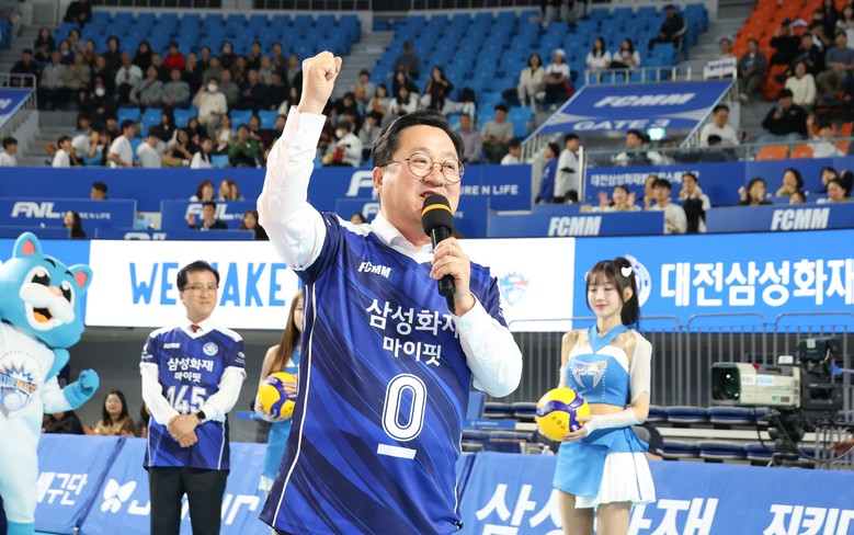 [대전 세계타임즈=이채봉 기자] 이장우 대전시장은 21일 대전충무체육관에서, 6개월간의 V-리그 대장정에 나서는 연고팀 대전 삼성화재 블루팡스의 승리를 기원하는 시구에 참여했다.
