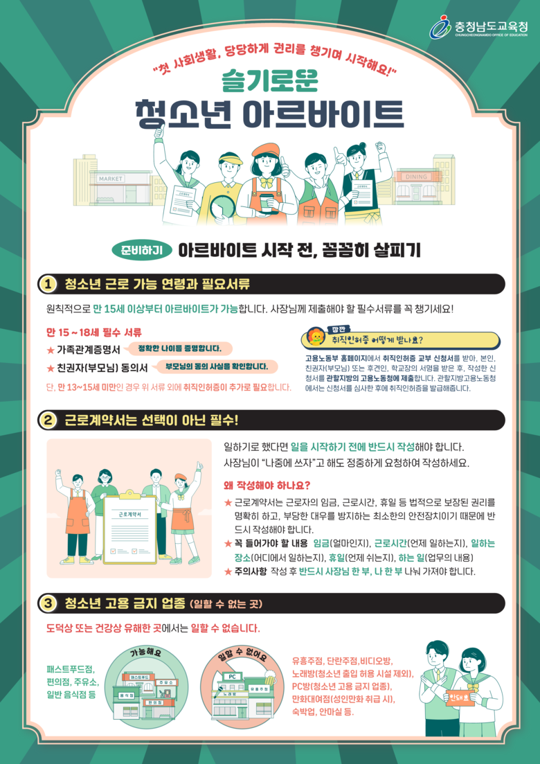 이번 교육자료는 청소년들이 아르바이트를 시작하기 전 반드시 알아야 할 핵심 내용을 중심으로 구성됐다. 주요 내용은 ▲ 청소년 근로 가능 연령과 필요서류 ▲ 근로계약서 작성 ▲ 청소년 고용 금지 업종 등을 안내하고, 일하는 청소년의 권리를 지키기 위해 ▲ 최저임금 ▲ 일하는 시간과 쉬는 시간 ▲ 산재와 성희롱 예방을 위한 자료로 구성되었다.