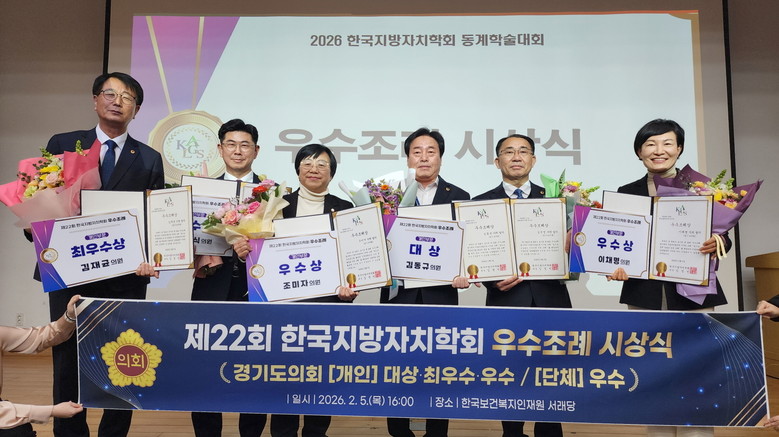 [경기도 세계타임즈=송민수 기자] 경기도의회(의장 김진경)가 5일 ‘제22회 한국지방자치학회 우수조례 시상식’에서 개인부문 대상과 단체부문 우수상 등 총 8건을 수상하며 전국 최고의 입법 역량을 입증했다.