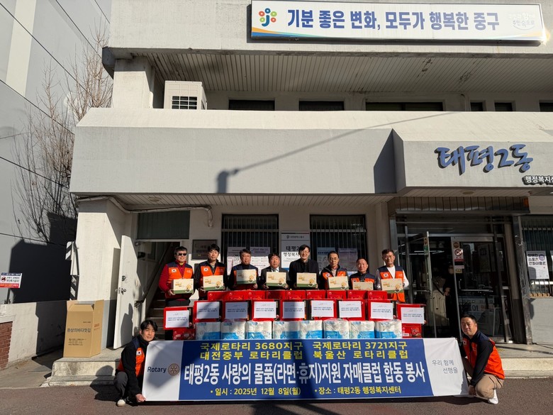 이번 후원은 지난 9월 3일 국제로타리 3680지구 대전중부 로타리클럽과 태평2동 주민자치위원회가 ‘나눔 실천을 위한 업무협약’을 체결한 이후 두 번째로 진행된 나눔 활동으로, 특히 저소득 다자녀‧장애인 가구, 청소년 시설을 중심으로 지원이 이루어졌다.