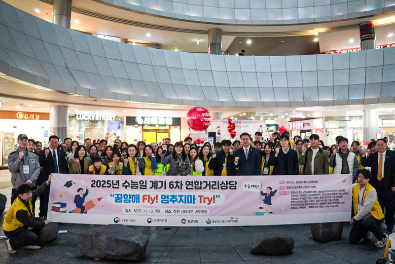 [세계타임즈]최성룡기자 =경상남도(도지사 박완수) 출연 기관인 경상남도청소년지원재단(원장 박춘덕)과 경상남도일시청소년쉼터(소장 최문주)는 11월 13일(목)「꿈 향해 Fly! 멈추지마 Try!」주제로 창원시티세븐 내부광장일대에서 수능으로 인한 긴장과 불안감이 큰 청소년들에게 정서적 지지와 격려를 전하고 경상남도일시청소년쉼터와 도내 유관기관들 등 공적 지원체계 정보제공을 위한 취지로 연합거리상담을 진행했다.
