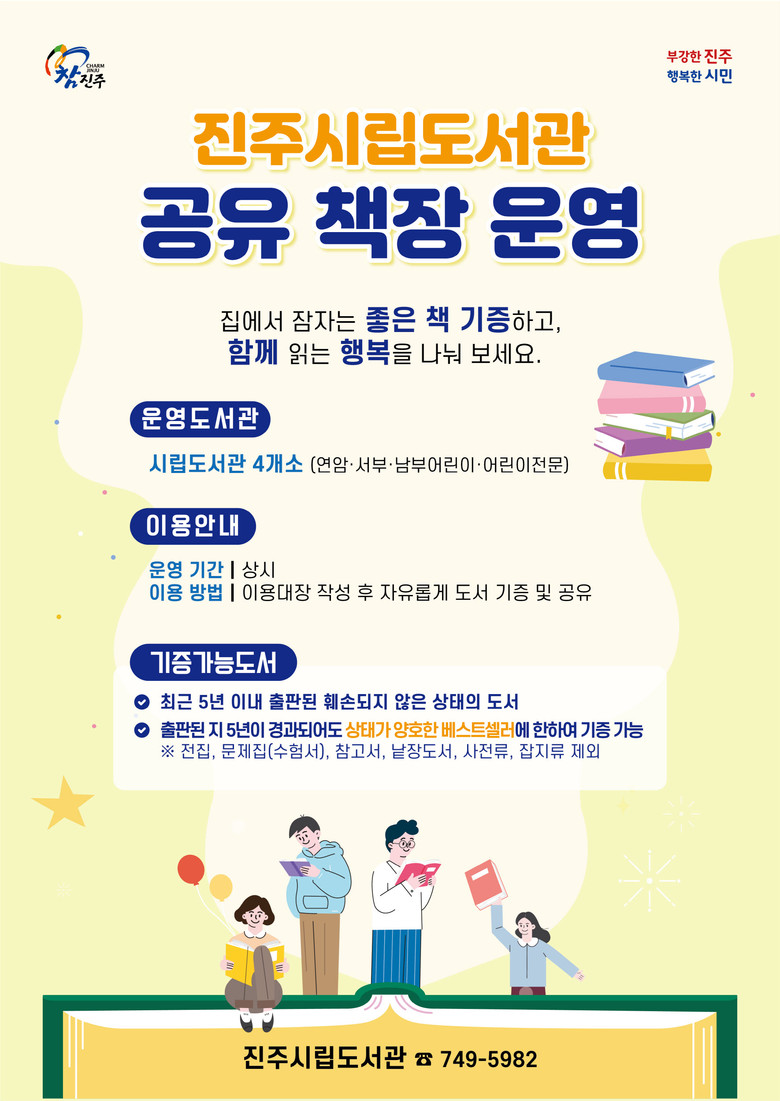 공유 책장은 시립도서관 4개소(연암, 서부, 남부어린이, 어린이전문도서관)에 마련된다. 시민 누구나 이용 대장만 작성하면 개인 도서를 공유 책장에 기증할 수 있으며, 마음에 드는 도서를 가져갈 수도 있는 자율 공유 코너로 운영될 예정이다.