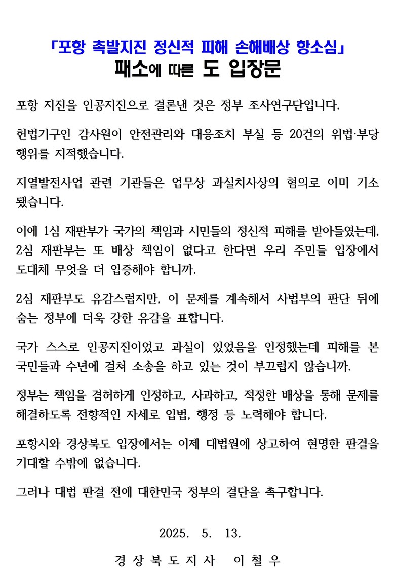 이 도지사는 “1심 판결에서 인정된 시민들의 정신적 피해와 국가의 과실이 항소심에서 뒤집힌 것은 납득하기 어렵다”며, “포항시민의 정신적 보상과 법적 권리 회복을 위해 입법적 절차 등 모든 노력을 함께 할 것”이라고 강조했다.