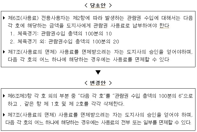 - 조례 제7조(사용료의 면제) 사용료를 면제받으려는 자는 도지사의 승인을 얻어야하며, 다음 각 호의 어느 하나에 해당하는 경우에는 사용료의 전부 또는 일부를 면제할 수 있다. 로 수정하여 의결하였다.
