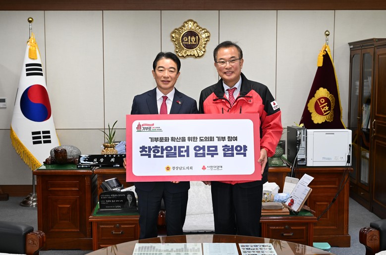 [경남 세계타임즈=최성룡 기자] 경상남도의회(의장 최학범)는 17일 집무실에서 경남사회복지공동모금회와‘착한일터’업무협약을 맺었다.