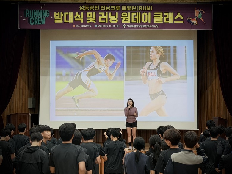 지난 10월 31일(금) 광희중학교에서는 런더풀(RUNderful) 대표 인플루언서 안정은 러닝전도사를 초청하여 「2025 성동광진 러닝크루 별빛런(RUN) 발대식 및 러닝 원데이클래스」를 개최하였다. 이날 190여 명의 학생과 교사는 러닝 기본자세, 주법, 런티켓, 부상 예방 스트레칭 등을 배우고 실제 러닝크루 체험 활동을 진행했다.