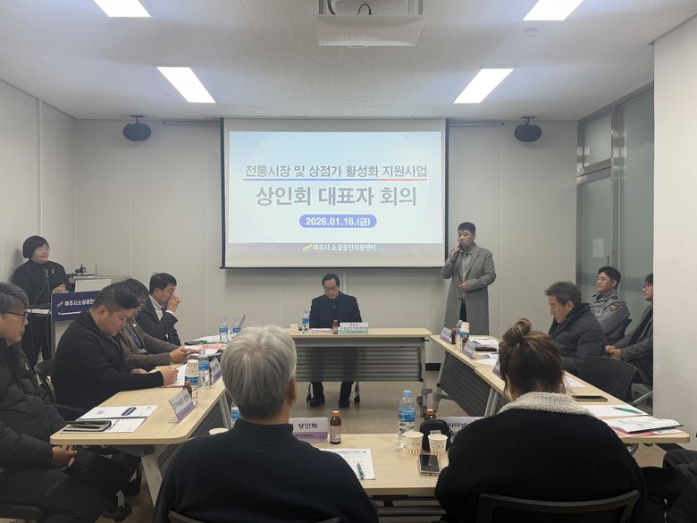 [여주시 세계타임즈=송민수 기자] 여주시 소상공인지원센터(센터장 유준희)는 지난 1월 16일 센터 회의실에서 상인회 대표자 회의를 개최하고, 전통시장 및 상점가 활성화 지원사업을 비롯한 2026년 여주시소상공인지원센터 주요 사업안내와 지역상권 활성화 방안에 대해 논의했다.