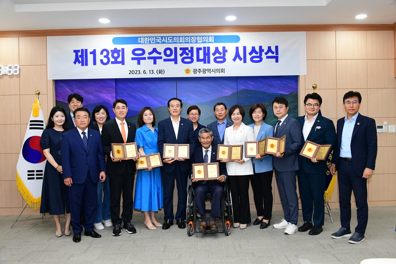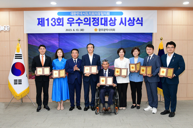 [광주 세계타임즈=손권일 기자] 광주광역시의회는 ‘제13회 우수의정대상’ 수상자로 8명 의원(명진, 박수기, 서용규, 서임석, 심창욱, 정다은, 최지현, 홍기월)이 선정되어, 13일(화) 시의회 열린시민홀에서 시상식을 개최했다.