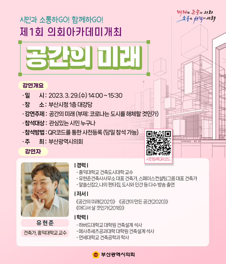 ◈ 3. 29. 14:00 부산시청 대강당에서 건축가 유현준 초청, ‘제1회 의회아카데미’ 개최