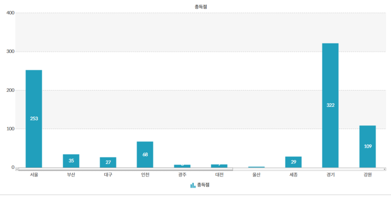 | ▲전국동계체전 사전경기 각 시군별 총득점 현황(15일 17시 기준).[사진=전국동계체육대회 홈피 캡쳐] |