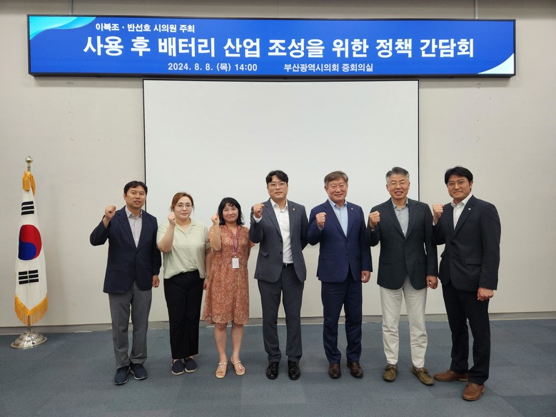 [부산 세계타임즈=이용우 기자] 부산광역시의회 건설교통위원회 이복조 의원(국민의힘, 사하구 장림1·2동, 다대1·2동)과 기획재경위원회 반선호 의원(더불어민주당, 비례대표)이 8월 8일 부산시의회 2층 중회의실에서 사용 후 배터리 산업 조성을 위해 관련 업계 및 관련 부서와 함께 정책간담회를 진행했다.