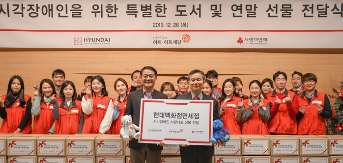 [서울=세계타임즈 이장성 기자] 현대백화점면세점이 26일 오전 연말연시를 앞두고 서울 사회복지공동모금회(회장 윤영석, 이하 서울 사랑의열매)를 통해 저소득 시각장애인학교 학생들을 위해 특별 제작한 '사랑나눔 선물 박스'를 전달했다.