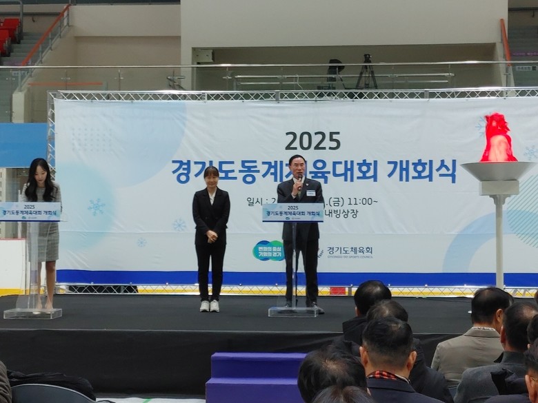 | ▲이원성 경기도체육회장이 31일 의정부 실내빙상장에서 열린 '2025 경기도동계체육대회' 개회식에서 대회사를 발표하고 있다. |