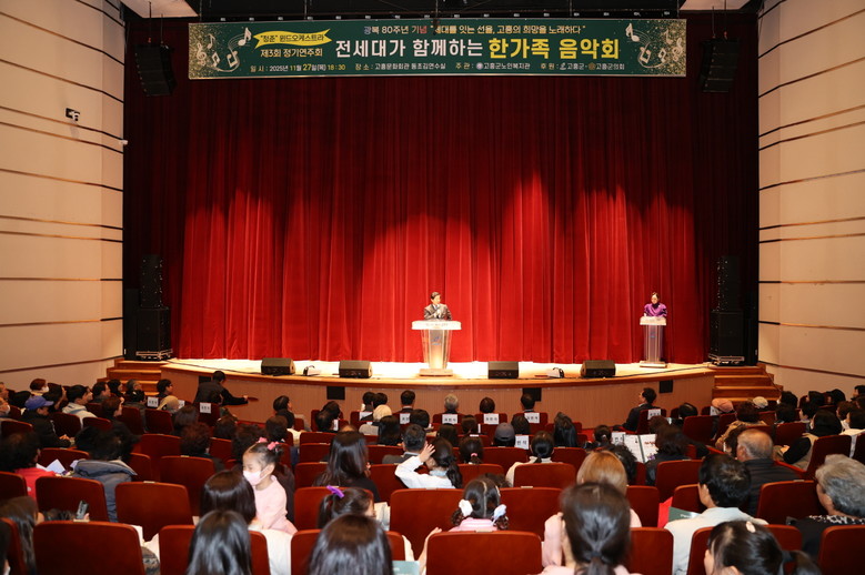 [고흥군 세계타임즈=우덕현 기자] 고흥군(군수 공영민)은 지난 27일 고흥문화회관에서 고흥군노인복지관 어르신들로 구성된 ‘청춘’윈드오케스트라와 관내 4개 학교(고흥동초, 동강초, 동강중, 점암초) 학생들이 함께 어우러진 전 세대가 함께하는 한가족 음악회를 개최했다고 밝혔다.