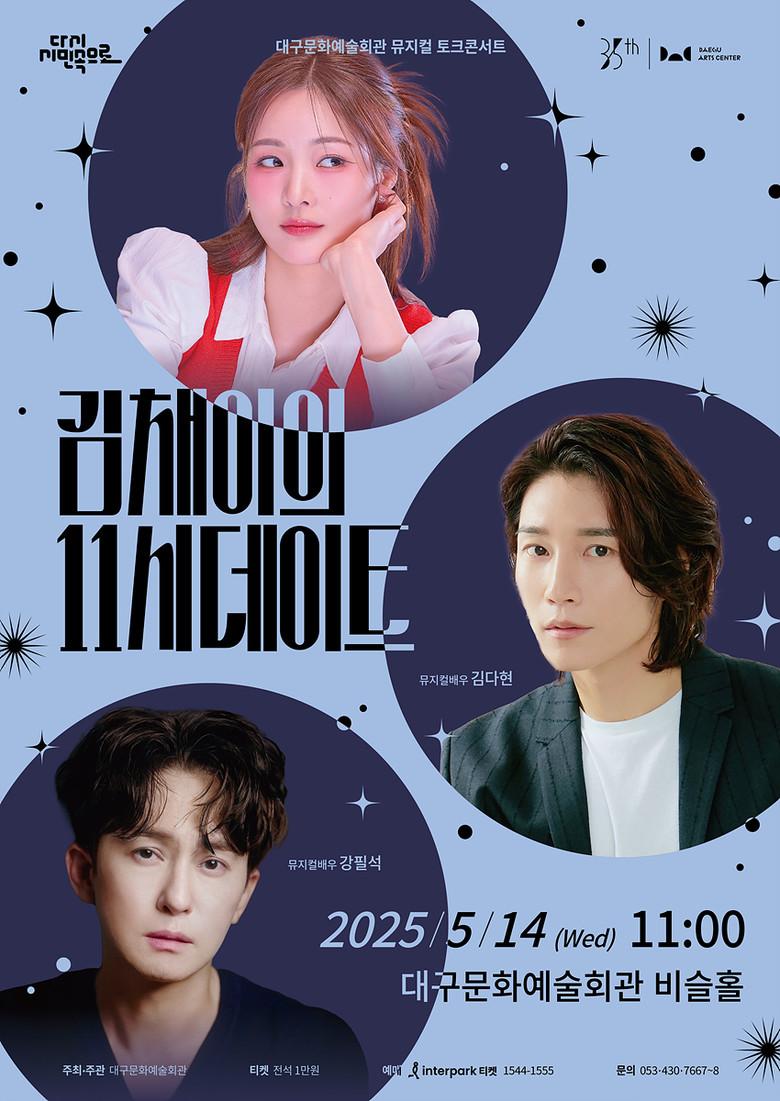 ▸ 대구시립극단 김채이의 진행으로 만나는 감동과 웃음의 11시 데이트 [세계타임즈=대구 한윤석 기자] 대구문화예술회관이 선보이는 뮤지컬 토크 콘서트 ‘김채이의 11시 데이트’가 오는 5월 14일(수) 오전 11시, 대구문화예술회관 비슬홀에서 열린다.