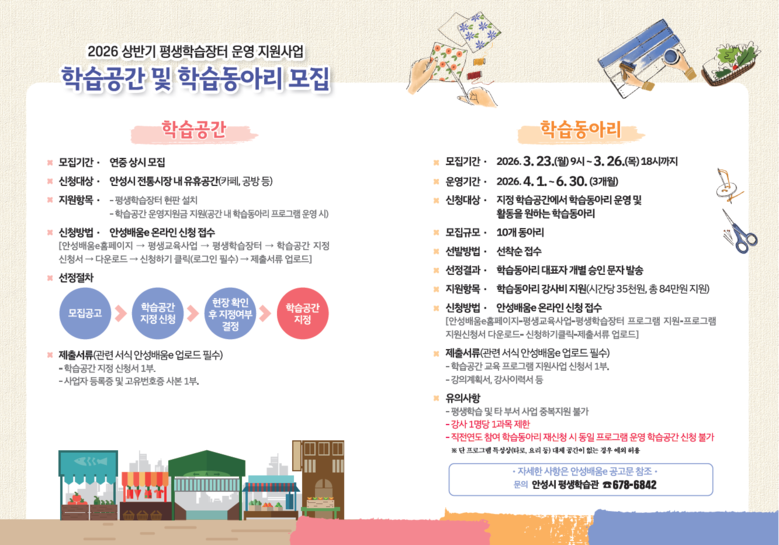 자세한 사항은 안성시평생교육통합플랫폼(안성배움e) 또는 안성시 평생학습관(☎031-678-6842)으로 문의하면 된다.