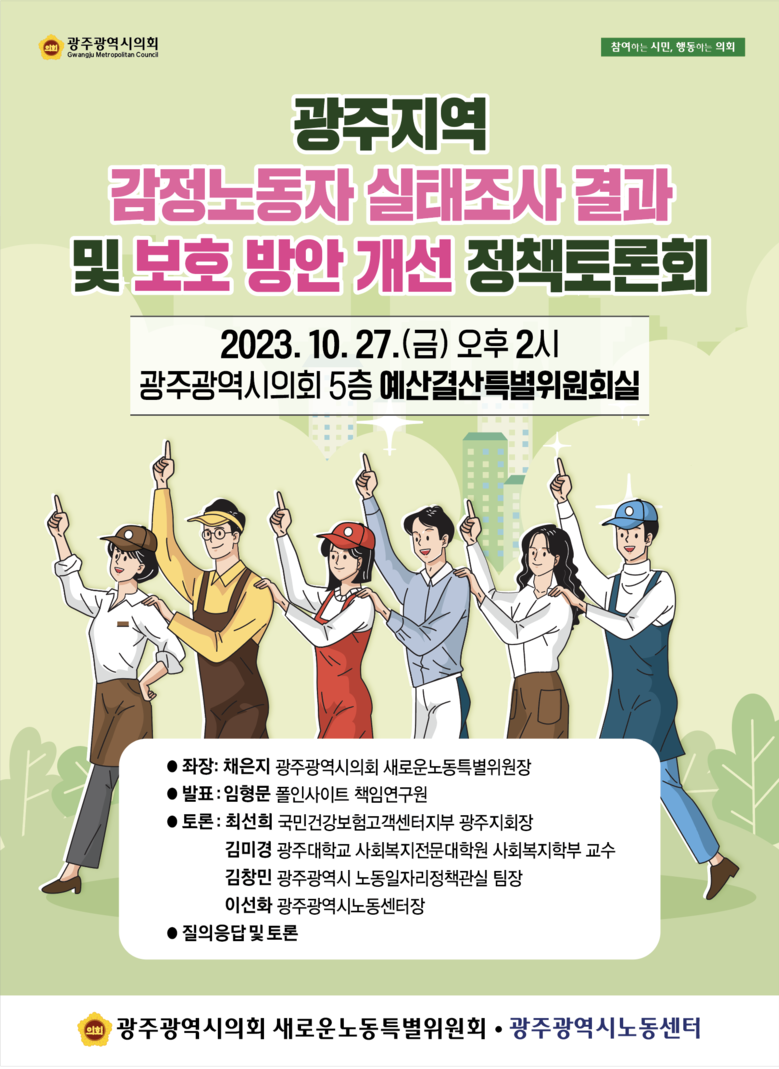 채은지 위원장이 좌장을 맡은 이번 토론회는 지난 4월부터 진행되었던 ‘2023 광주지역 감정노동자 실태조사에 대한 결과보고’를 중심으로 근본적인 문제와 해법에 대해 논의할 계획이다.