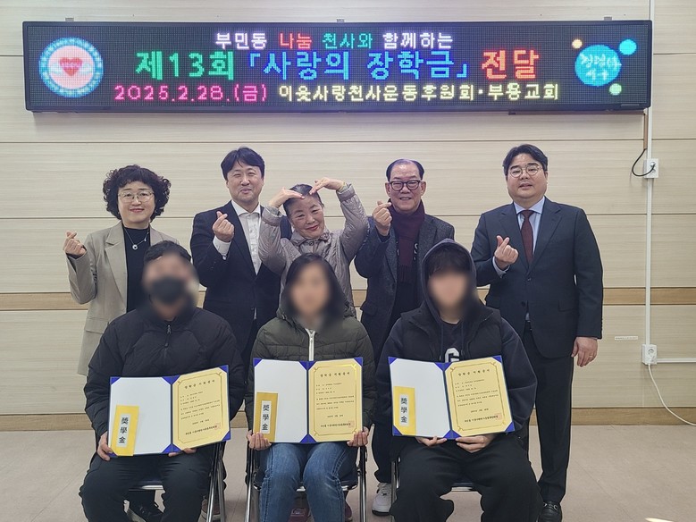 [서구 세계타임즈=이용우 기자] 부산 서구 부용교회(담임목사 장성완)와 부민동 이웃사랑천사운동후원회(회장 문성욱)는 28일 부민동 회의실에서 제13회 장학금 전달식을 개최하여 2025년 대학 신입생 3명에게 총 300만 원 장학금을 전달했다.