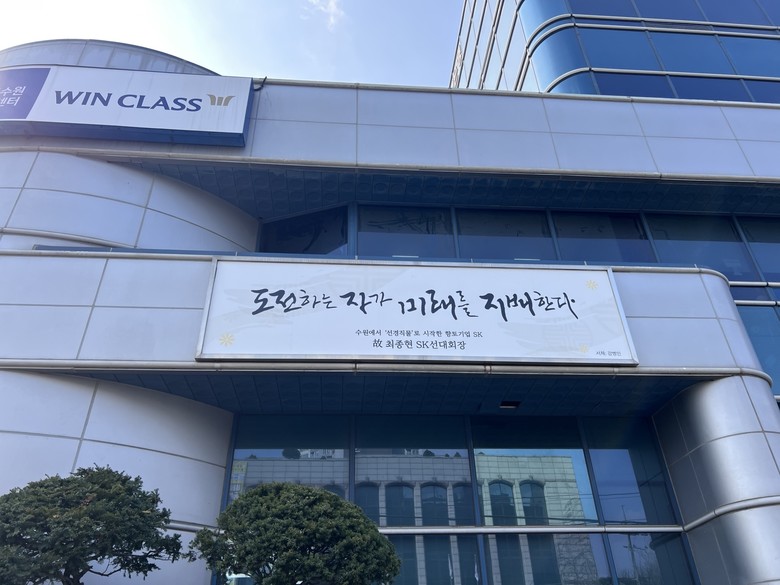 [수원시 세계타임즈=송민수 기자] 수원특례시(시장 이재준)는 SK 창업주 고 최종건 회장과 고 최종현 선대회장의 어록을 담은 ‘2026 수원희망글판’ 문안을 에이케이(AK)플라자 수원점 외벽과 아이비케이(IBK)기업은행 동수원지점 외벽에 게시했다.