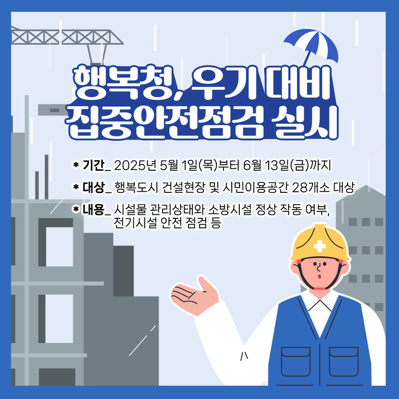 김상기 사업관리총괄과장은 “이번 점검은 여름철 자연재난으로부터 국민의 생명과 재산을 선제적으로 보호하기 위한 것”이라며 “앞으로도 건설현장에서의 사고 예방과 안전문화 정착에 최선을 다하겠다”고 말했다.