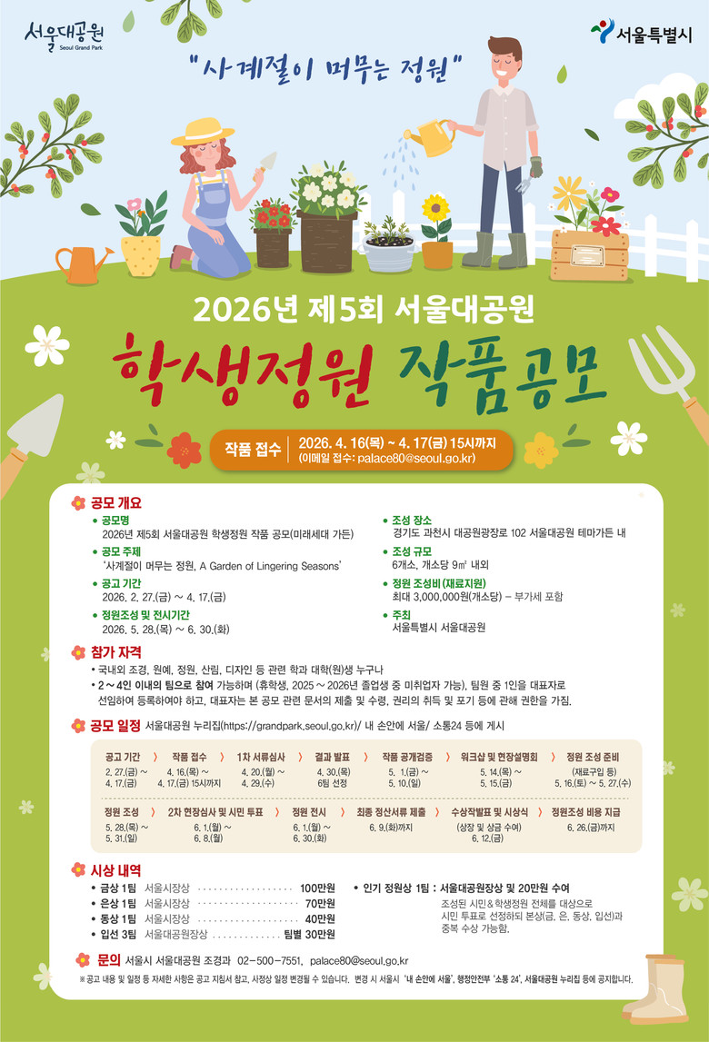 올해로 5회째를 맞는 이번 공모전의 주제는 ‘사계절이 머무는 정원(A Garden of Lingering Seasons)’이다. 기후 위기 시대에 계절의 변화와 순환이 지닌 의미를 되새기고, 계절감이 살아 있는 식재와 공간 연출을 통해 자연과 사람이 조화를 이루는 지속가능한 정원을 조성하자는 취지를 담았다.