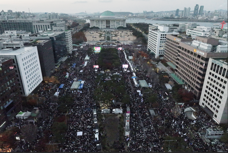 일 오후 서울 여의도 국회 앞에서 열린 '내란죄 윤석열 퇴진! 국민주권 실현! 사회대개혁! 범국민촛불대행진'에 수많은 시민이 모여 도로를 가득 메우고 있다. 2024.12.7