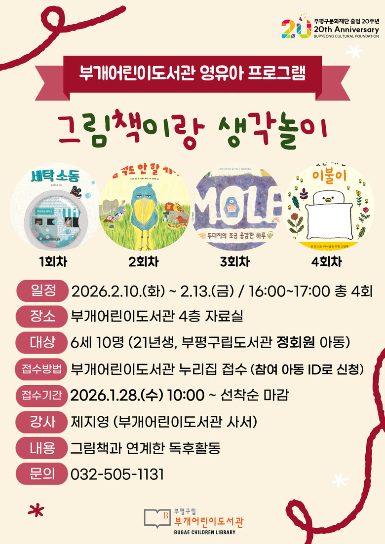 이어 ‘그림책이랑 생각 놀이’는 6세 유아를 대상으로 2월 10일부터 13일까지 운영된다. 그림책을 함께 읽고 독서퀴즈, 미술 활동, 신체 놀이 등을 통해 자신의 생각을 자유롭게 표현하고 또래와 소통하는 시간을 갖는 프로그램이다.
