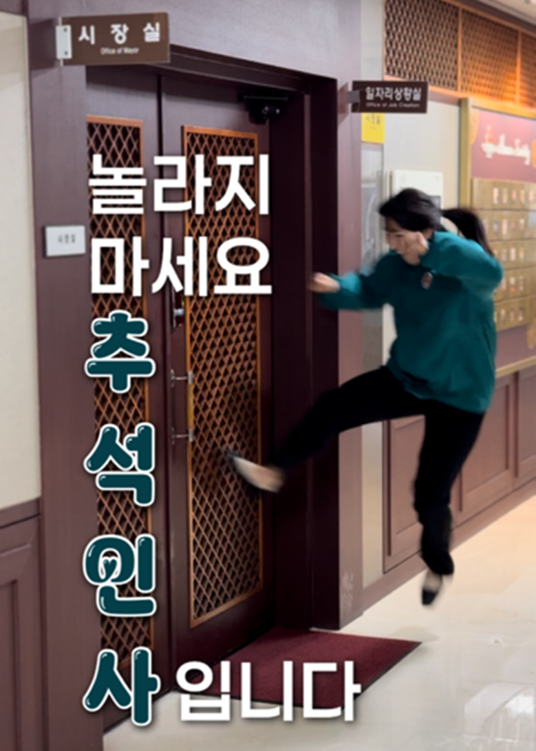 | ▲ 경주시청 공무원이 시장실 문을 발로 차고 들어가는 장면으로, 문이 열리자 주낙영 경주시장이 등장해 “추석 인사드립니다”라고 전하며 웃음을 자아내고 있다. |