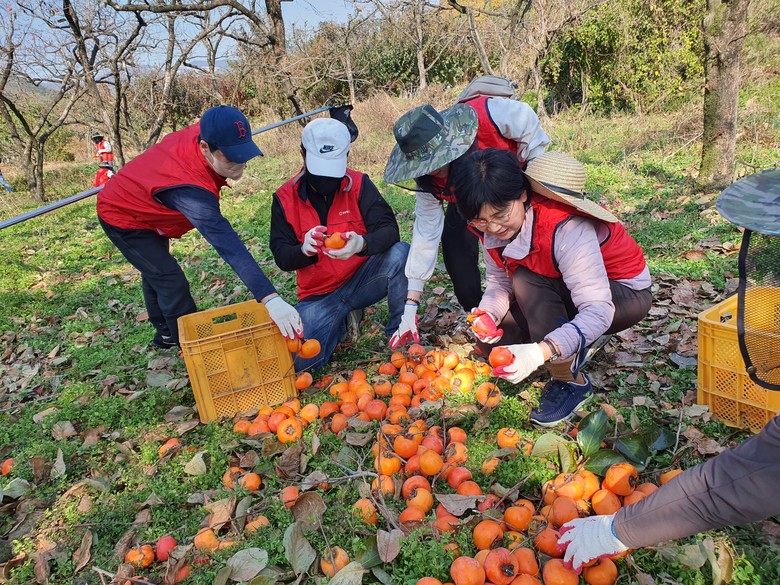 본격적인 감 수확기를 맞았지만 농촌인구의 고령화, 상승하는 인건비, 코로나19 장기화 등으로 인해 인력 수급에 어려움을 겪고 있는 농가에 조금이나마 보탬이 되고자 감 수확과 감 선별, 박스 작업 등을 함께하며 구슬땀을 흘렸다.