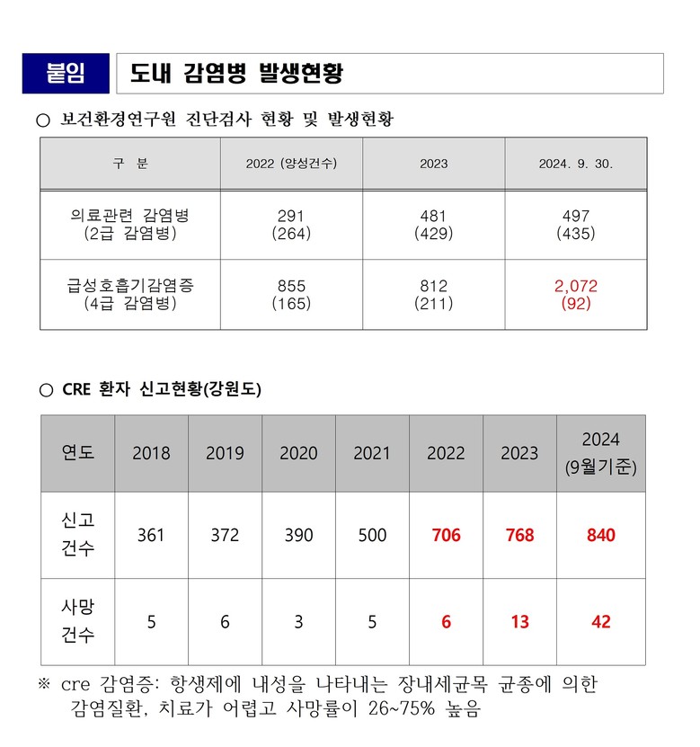 강원도로부터 제출받은 감염병 검사실적 및 양성 건수에 따르면, 격리가 필요한 2급 감염병인 의료 관련 감염병도 최근 3년간 평균 376건에 달했으며, 그중 치사율이 26~75%에 해당하는 CRE 감염증의 경우 21년까지 평균 400여 건에 그치던 환자 수가 22년 이후 평균 771건으로 대폭 증가한 걸로 나타났다.
