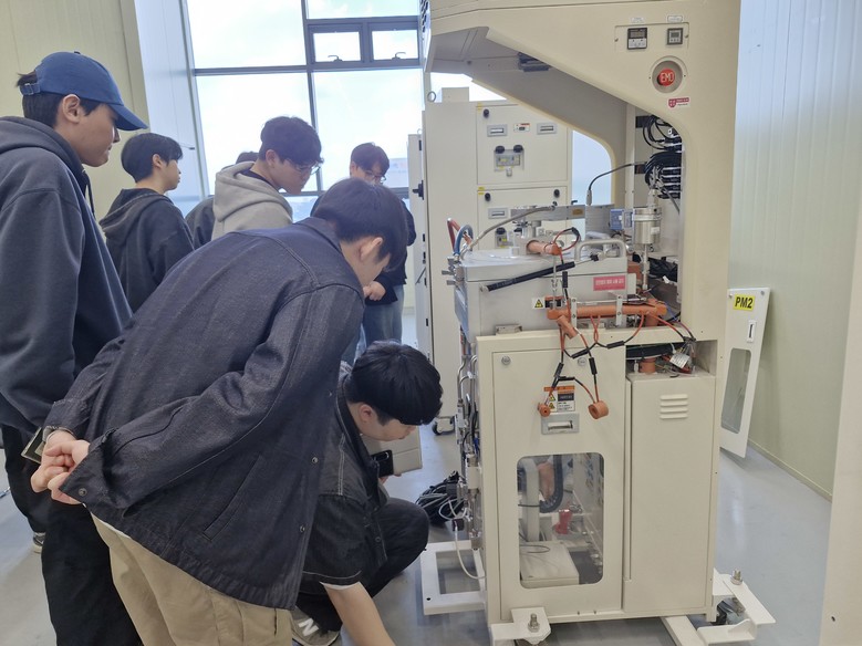 | ▲교육생들이 PM(Process Module) 장비를 직접 보고 만지며 반도체 장비 구조에 대해 학습하고 있다.(사진=용인시산업진흥원 제공) |