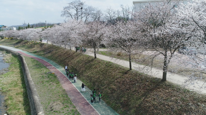 지역주민들과 어린이집 원아들이 봄나들이 장소로 영동천변 벚꽃길을 거닐며 봄의 낭만과 싱그러움을 즐기고 있다.
