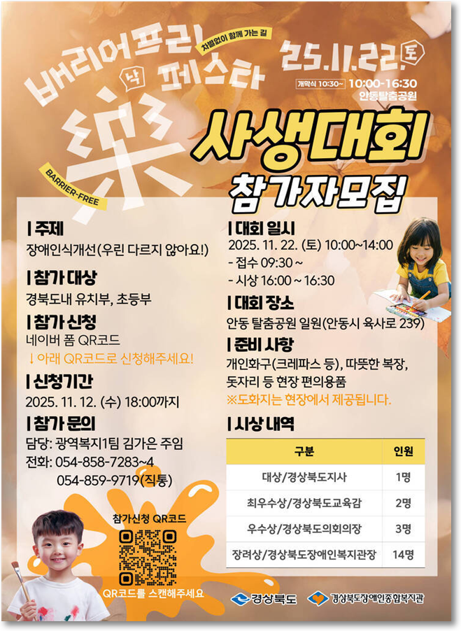 김호섭 경북도 복지건강국장은 “이번 행사는 배리어프리 문화 확산과 정착을 위해 경상북도가 선도적으로 추진하는 의미있는 축제”라며, “앞으로도 장애인과 비장애인이 편견 없이 어울리며 서로를 존중하는 건강한 지역 공동체를 만들기 위해 지속적으로 필요한 정책을 개발하고 추진해 나가겠다”고 밝혔다.