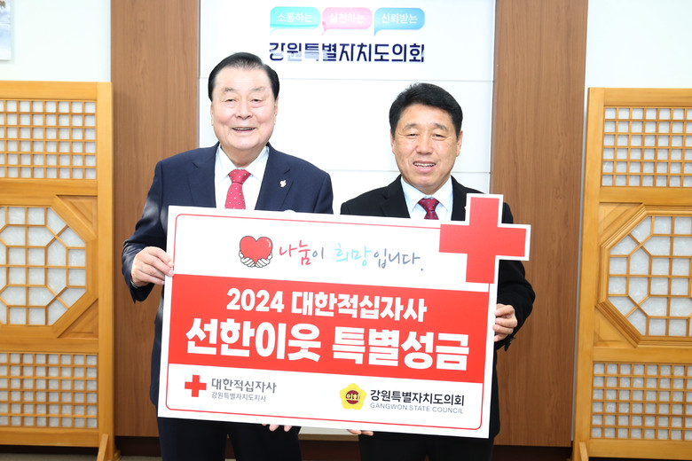 권혁열 강원특별자치도의회 의장은 강원특별자치도의회를 대표하여, 대한적십자사 강원특별자치도지사 이돈섭 회장에게 특별회비 3백만원을 전달하였다.