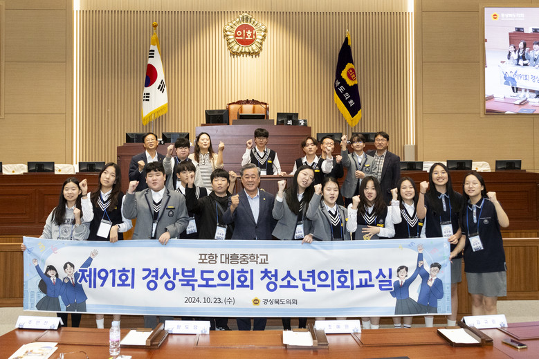 [경북 세계타임즈=한윤석 기자] 경상북도의회(의장 박성만)는 10월 23일(수) 본회의장에서 포항 대흥중학교학생 15명이 참여한 가운데『제91회 경상북도의회 청소년의회교실』을 개최했다.
