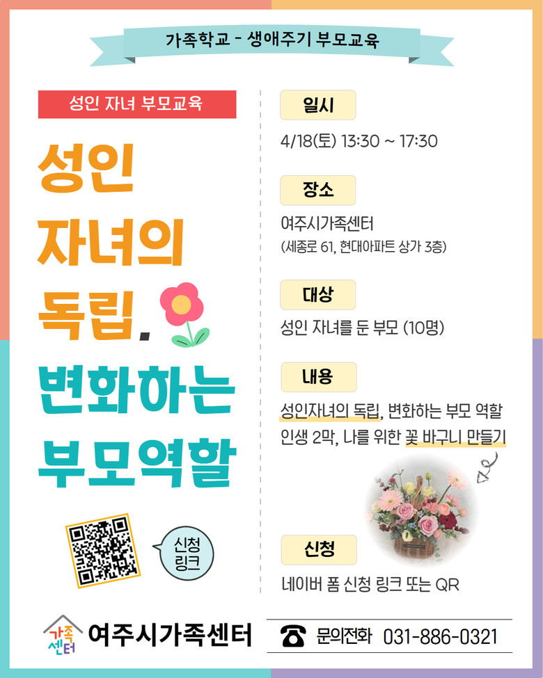 교육 신청은 여주시가족센터 홈페이지를 통해 가능하며. 자세한 사항은 여주시가족센터(☎ 031-886-0321)로 문의하면 된다.