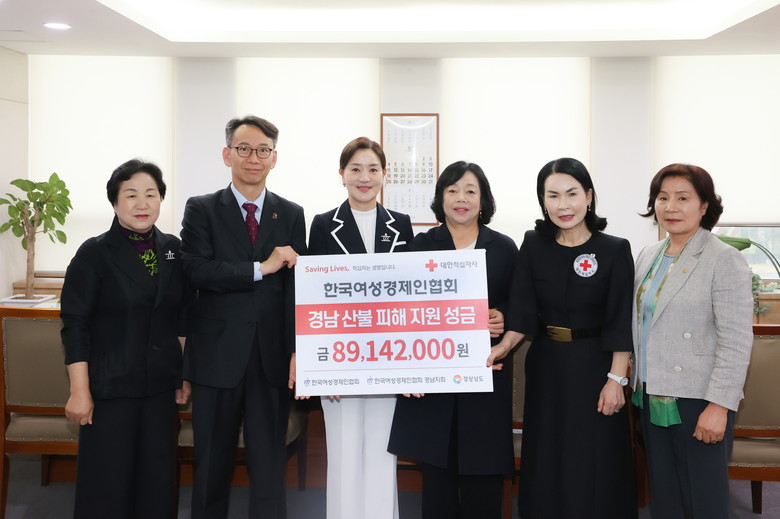 - 대한적십자사 경남지사를 통해 산불피해 복구 성금 지원 [세계타임즈=경남 최성룡 기자] 경상남도(도지사 박완수)는 9일 도청에서 한국여성경제인협회 경남지회(지회장 이명자)가 경남지역 산불 피해를 입은 이재민을 돕기 위해 성금 8,914만 원을 기탁했다고 밝혔다.