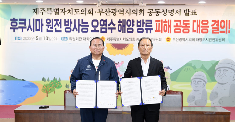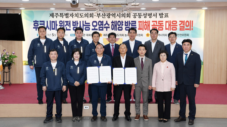 부산시의회와 제주도의회는 공동성명서에서 “대한민국 해양수도 부산시와 해양관광도시 제주도는 해양자원을 활용한 산업이 중심을 이루고 있는데, 방사능 오염수 방류에 대한 확실한 안전장치 없이 오염수가 방류된다면 부산시와 제주도의 경제 전반에 큰 위기를 맞이할 것”이라고 강조했다.