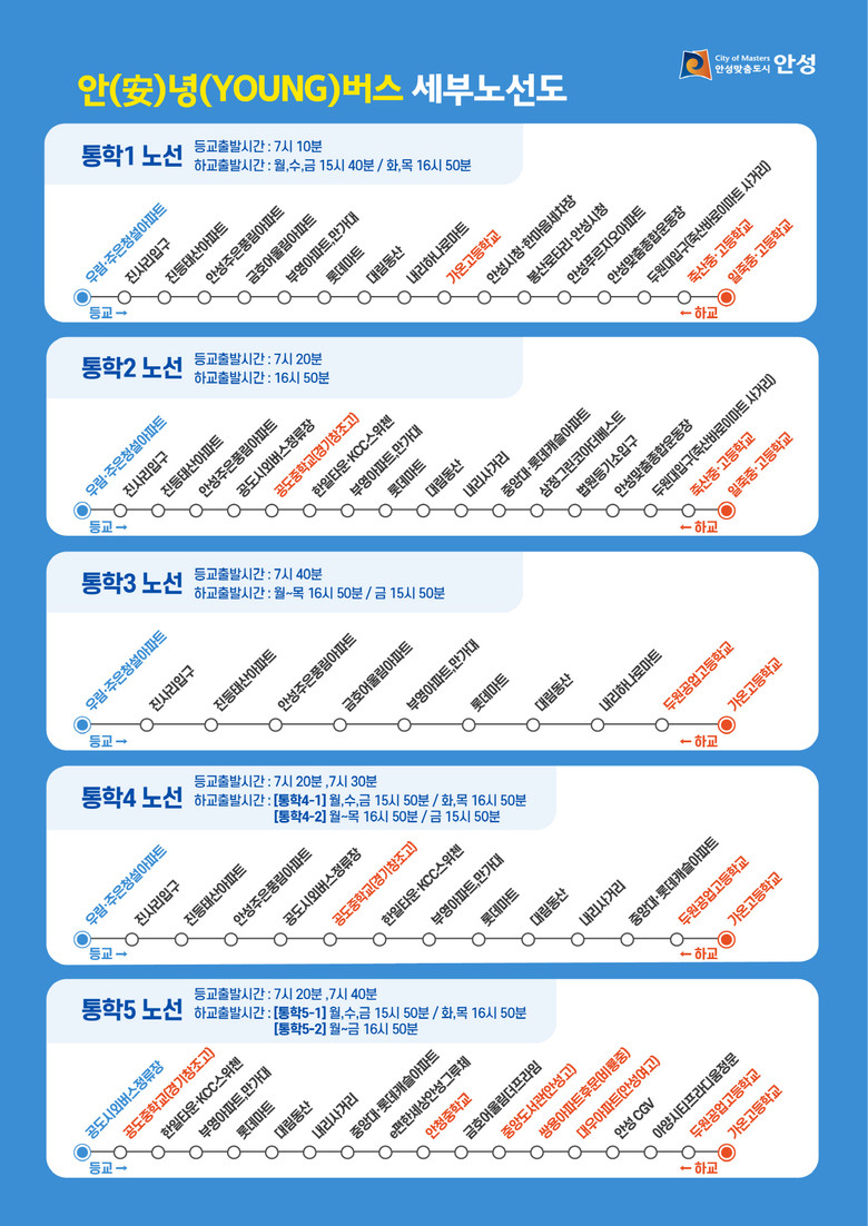 ‘안(安)녕(YOUNG)버스’는 ‘안성(安)’과 ‘젊음(YOUNG)’, 그리고 ‘밝은 인사(안녕)’의 의미를 담은 명칭으로, 학생들이 아침마다 밝고 안전하게 등교할 수 있도록 지원하는 데 목적이 있다.