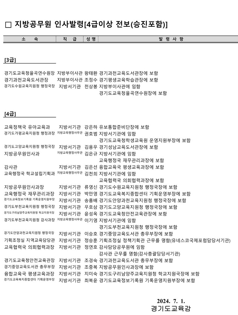 [경기도 세계타임즈=송민수 기자] 경기도교육청(교육감 임태희)이 2024년 7월 1일 자 지방공무원 총 1,514명의 인사를 21일 단행했다.