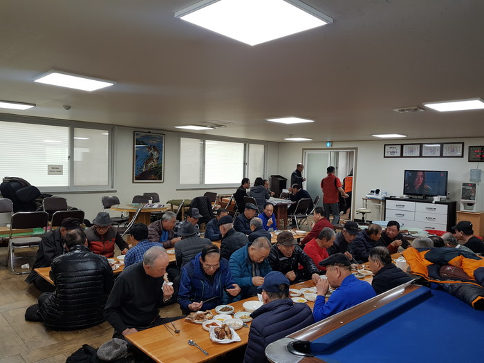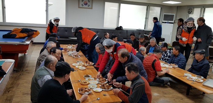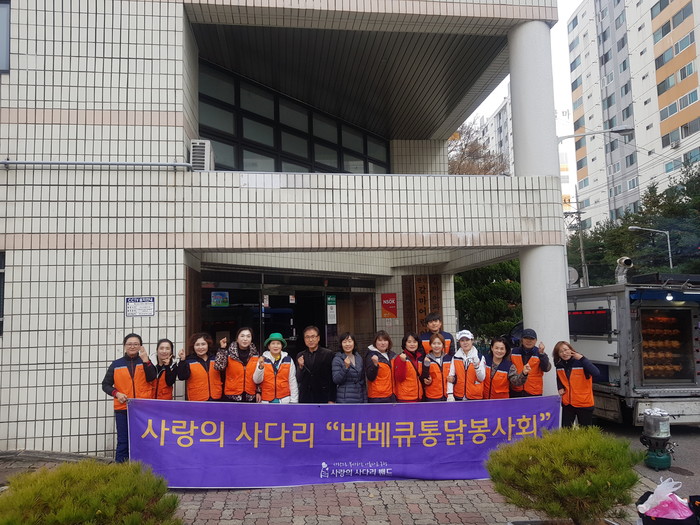 갈마아파트 경로당 허광범 회장은 “오늘 추운날씨에 사랑의 사다리 밴드 봉사단체에서 맛있는 바비큐 통닭을 지원해주어서 감사하다.”고 말했다.