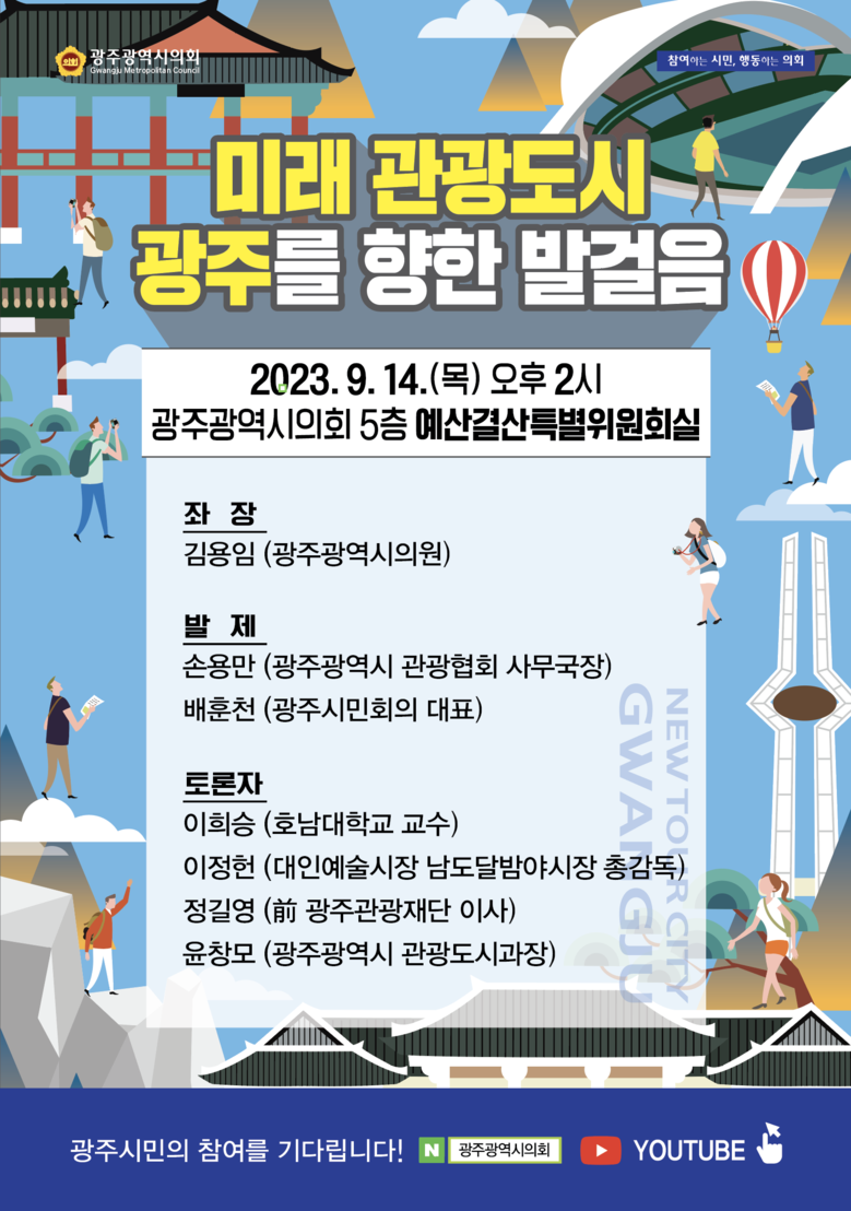 ‘미래 관광도시 광주를 향한 발걸음’을 주제로 한 토론회는 9월 14일 오후 2시, 광주시의회 5층에서 개최된다.