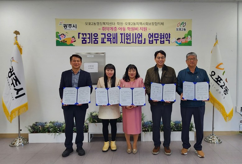 오포2동 지역사회보장협의체는 지난달 31일 취약계층 아동의 교육 격차 해소를 위해 지역 내 학원과 ‘꿈 키움 교육지원 사업’ 업무 협약식을 맺었다.