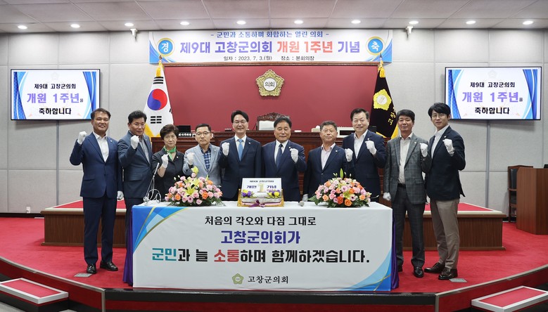 이어 3층 본회의장으로 이동하여 떡케익 커팅, 기념촬영을 끝으로 조촐한 개원 1주년을 마쳤다.임정호 의장은 기념사에서“지난 1년 동안, 제9대 고창군의회에 아낌없는 성원과 지지를 보내주신 고창군민과 보다 나은 고창을 위해 함께 뛰어준 동료 의원님들께 감사드린다.”면서“고창군의회는 군민의 작은 목소리도 더 귀 기울이고, 더 가까이 다가가는 현장행정을 통해 군민들로부터 항상 사랑받고 신뢰받는 주민 중심의 의정활동을 펼칠 것”을 약속했다.