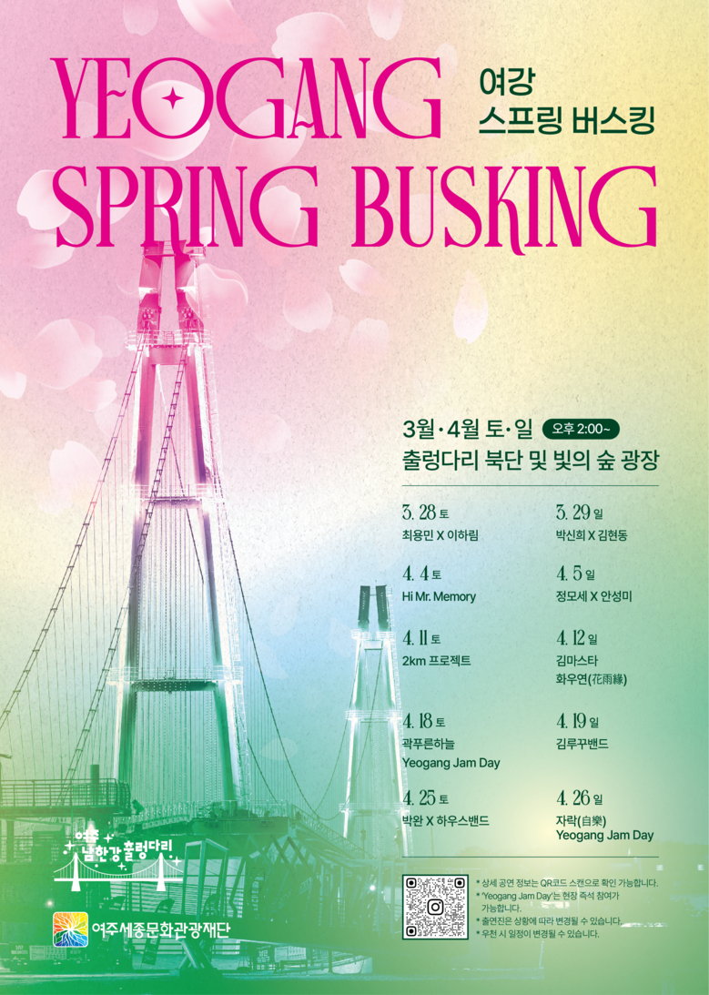 여주세종문화관광재단 이순열 이사장은 “여주 남한강 출렁다리는 이미 많은 분들이 찾는 여주의 대표 관광 명소로, 음악과 빛, 자연이 함께하는 버스킹 공연을 통해 ‘관광 여주’의 매력을 한층 더 높이겠다”며 “시민과 관광객 모두가 편안한 마음으로 찾아와 쉬어 갈 수 있는 힐링 문화공간으로 만들어가겠다”고 말했다.