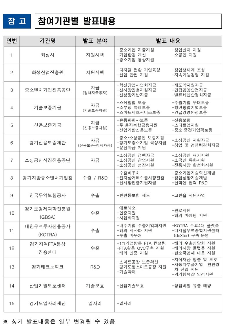 지원사업 발표는 ▲정책 분야(화성시, 화성산업진흥원) ▲일자리 분야(경기도일자리재단) ▲자금 분야(중소벤처기업진흥공단, 기술보증기금, 신용보증기금, 경기신용보증재단) ▲판로·수출분야(경기지방중소벤처기업청, 경기도경제과학진흥원, 경기지역FTA통상진흥센터) ▲R&D 분야(경기지방중소벤처기업청, 경기테크노파크) ▲소상공인 분야(소상공인시장진흥공단) 순으로 진행된다.