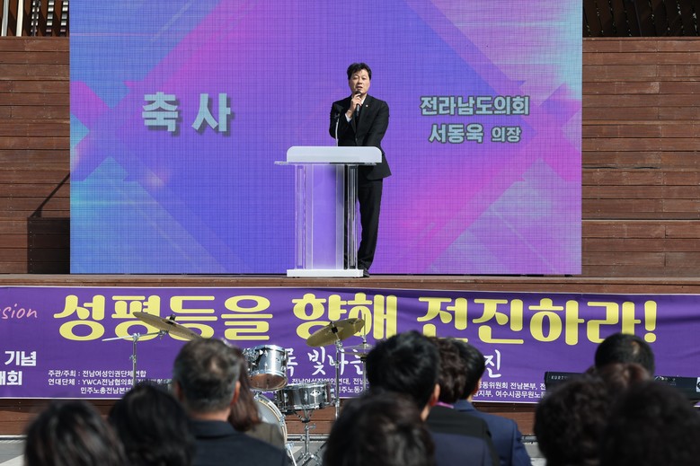 [전남 세계타임즈=우덕현 기자] 전라남도의회 서동욱 의장은 3월 8일 여수 이순신광장에서 ‘3·8 세계 여성의 날’을 기념해 열린 제15회 전남여성대회에 참석해 “전라남도의회에서도 우리 사회의 구조적 성차별이 개선될 수 있도록 관심과 지원을 아끼지 않겠다”고 밝혔다.